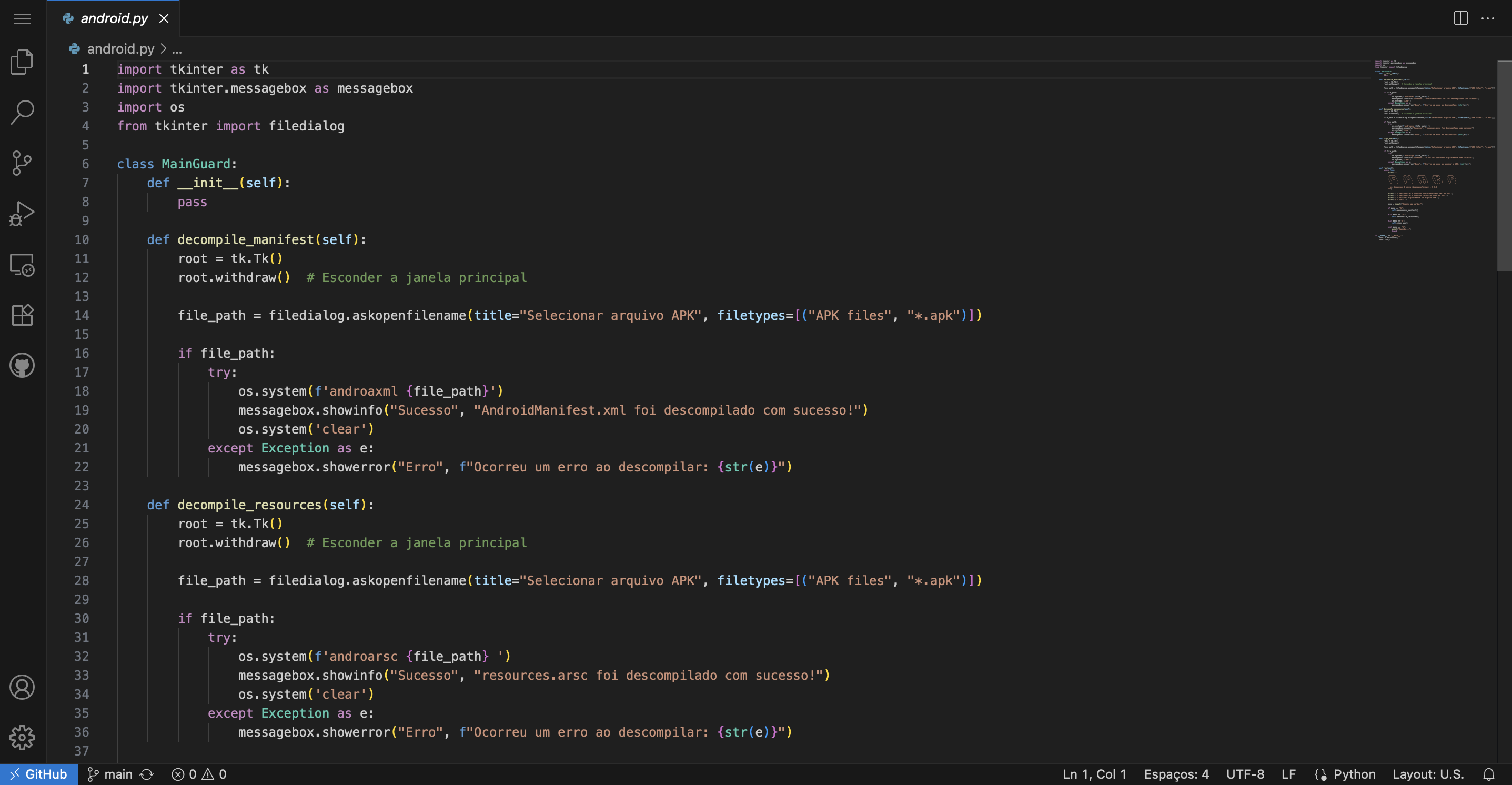 Seleção interativa de arquivos APK via janela do Tkinter, permitindo ao usuário escolher o arquivo a ser descompilado.