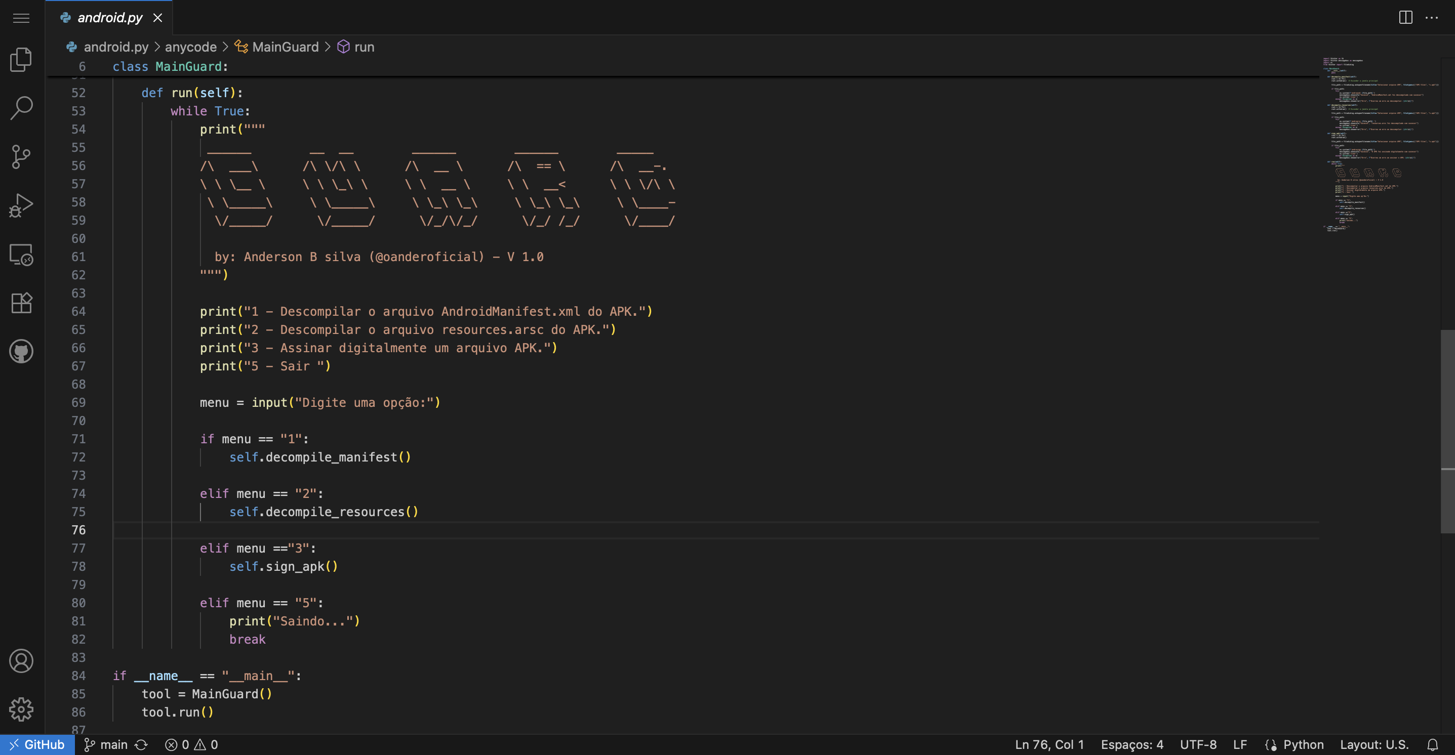 Ferramenta em Python para descompilar e assinar APKs, com seleção de arquivos via Tkinter e uso de utilitários externos (androaxml, androarsc, androsign).